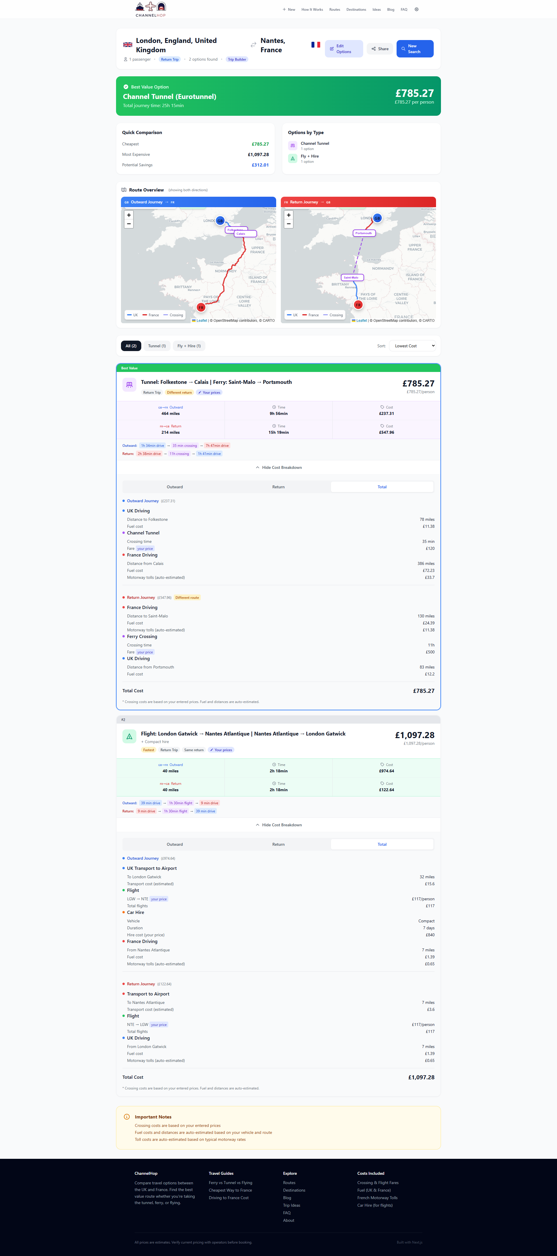 Expand any result card to see exactly where your money goes — UK fuel, crossing fare, French fuel, tolls — split by outward and return journey.
